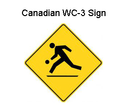 As it turns out, the person in Portland who scribbled the ball onto that sign was not the first to recognize the poignancy of this image. In Canada, the standard playground warning sign already features this basic representation (with the somewhat more clumsy graphic on their WC-3 sign). Adopting the new sign in the United States would not only improve the legibility and effectiveness of the warning, but would also help improve recognition through greater consistency. Perhaps the Canadian sign could even be updated to an improved, new standard, which would be fully consistent on both sides of the border.