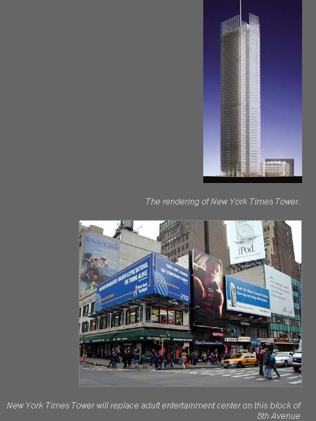The destruction of space continues to enlarge the new Times Square, as Eighth Avenue has been fragmented from the rest of Times Square.  It is a remnant of the old Times Square, its appearance has changed little and there are a couple of adult uses that are still holding on.  These differences have become the focus of attention, and are being leveraged (see Figure 4) to destroy 8th Avenue and integrate it into the new Times Square.  The zoning changes allowing transfer of bulk to 8th Avenue were an integral part of this process, and the 42nd Street Development Project continues to play a role with the building by Arquitectonica on the corner of 8th and 42nd now nearing completion and the projected Times Tower.