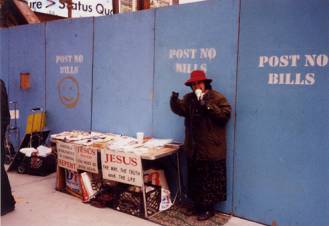 I should perhaps clear up one of my own previous misconceptions concerning the destruction of space in Times Square.  My initial impression was that the decline of soapbox ministers was the result of aggressive actions by police and BID security concerned about them bothering tourists.  While some harassment may have occurred, this is more likely the result of the destruction of the previous social space.  The soapbox ministers existed in a symbiotic relationship with the area’s marginal population, and homosexuals in particular, which the preachers continually denounced as sinful.  The destruction of this marginal social space encompassed these evangelists.  Telling a middle class family on its way to a show at the New Victory Theater that they’re dirty and going to Hell just isn’t the same.